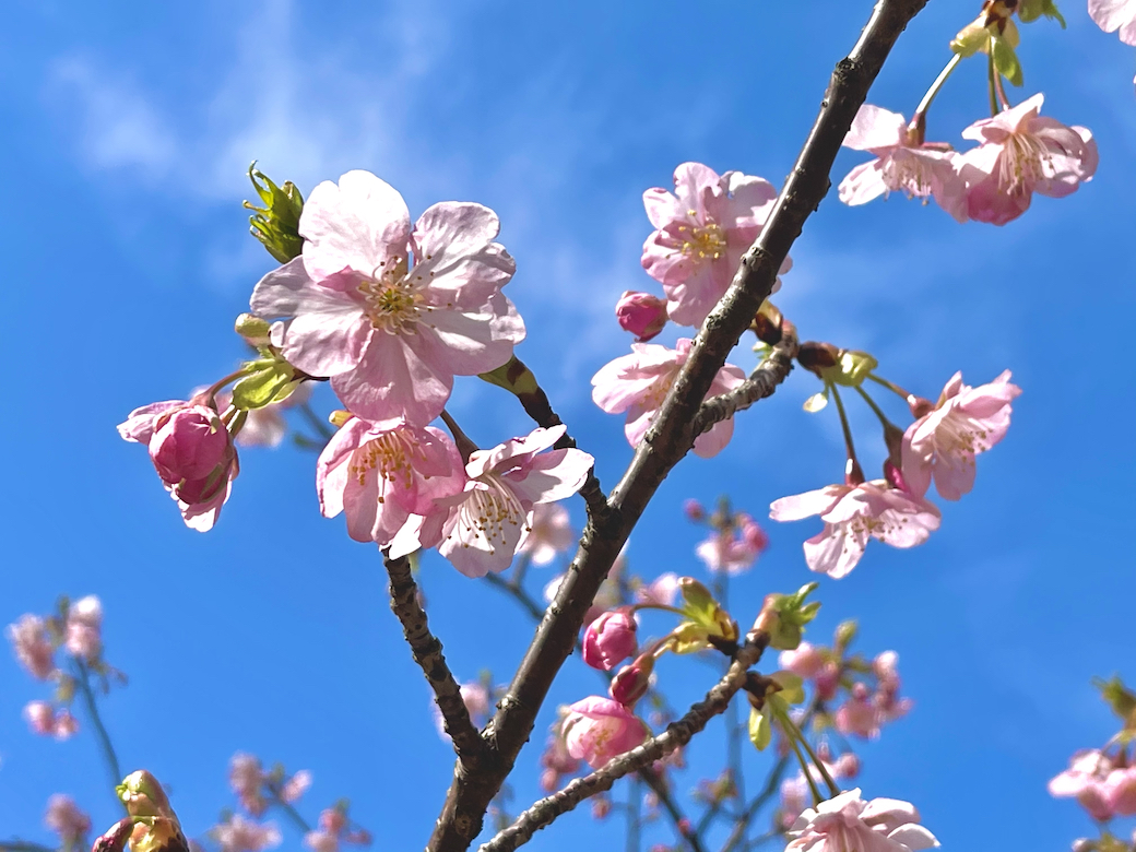 河津桜は、大島桜(オオシマザクラ)と寒緋桜(カンヒザクラ)の自然交雑から生まれた日本原産の桜で、静岡県の河津町に原木があるということで、河津桜と名付けられています。