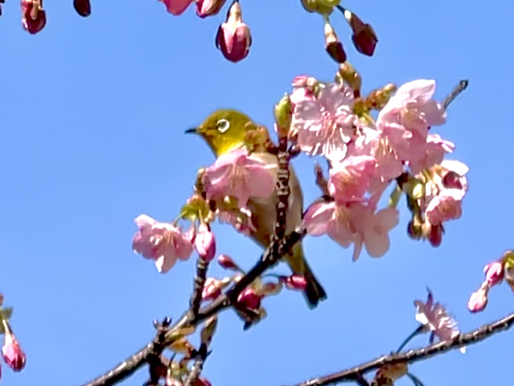 メジロが蜜を吸いに来てたので写真を撮りましたが、遠目からスマホの望遠で撮ったので、かなりピンボケしてしまいました(^^;