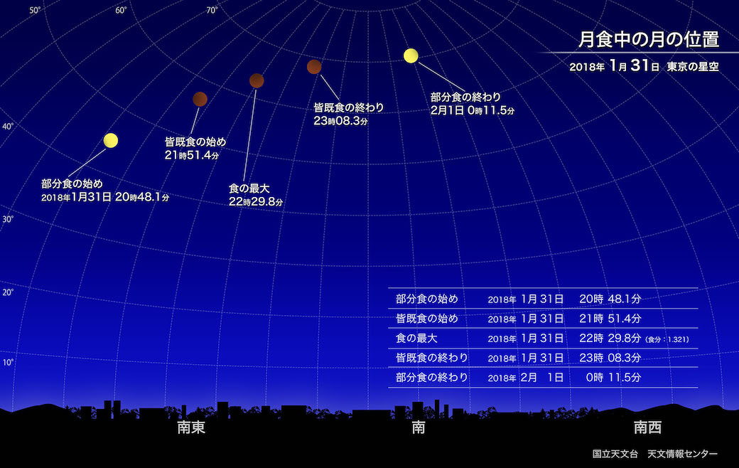 国立天文台によると、20時48分に欠け始め、21時51分には完全に欠けて皆既月食となります。