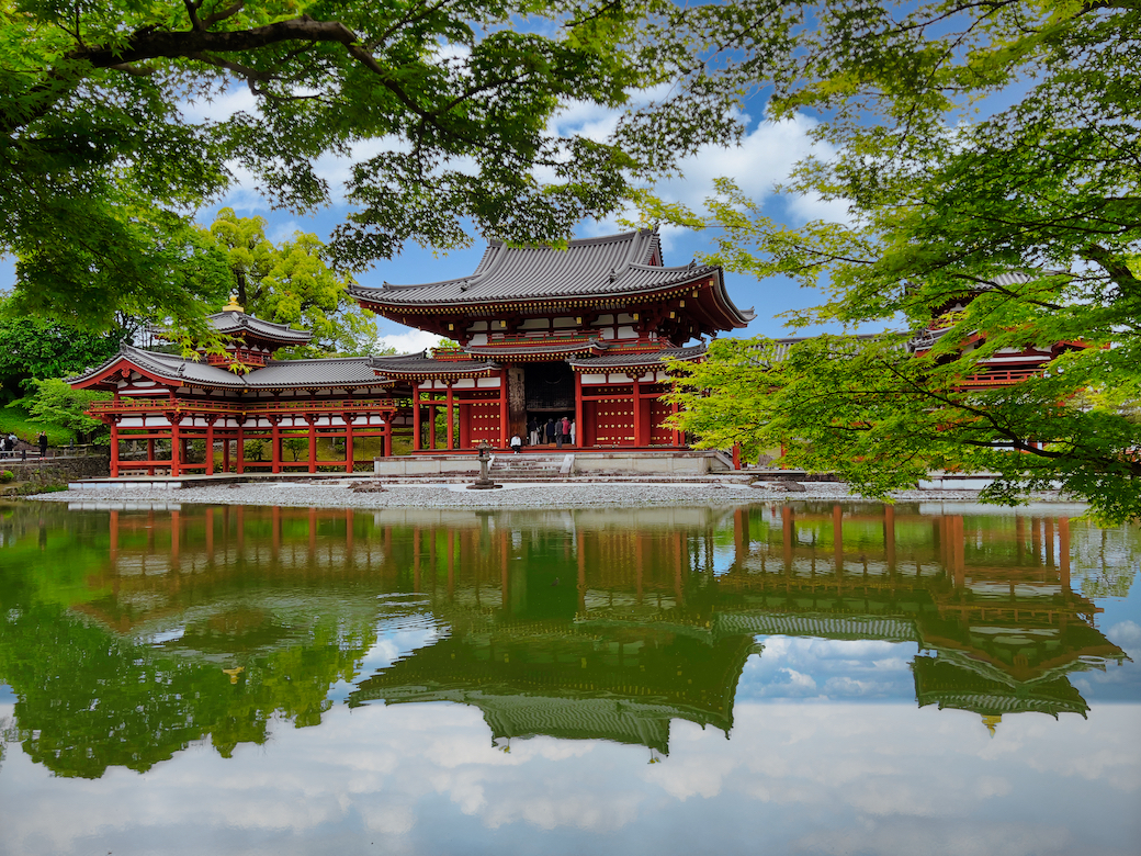 10円硬貨の絵柄にもなっている鳳凰堂は、極楽浄土の宮殿をモデルにしており、中堂、左右の翼廊、背後の尾廊からなる、他に類を見ない建物です。