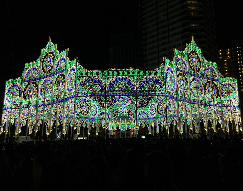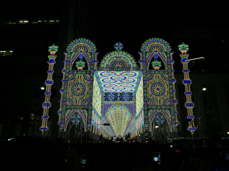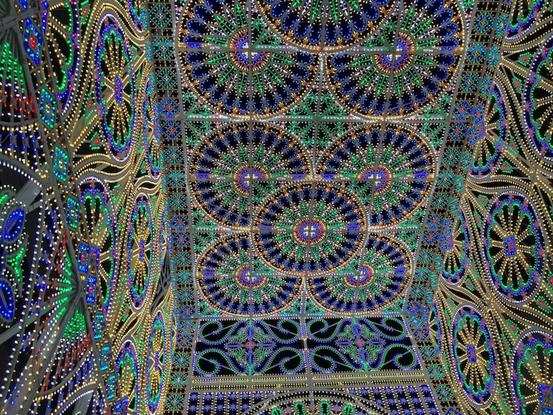 また、今年の特徴としては、今までは入り口の作品とそれに続くアーチで構成されていたのが、入り口から16mは天井の部分も作られて、光のトンネルをくぐるような形になっています。(上の写真は下から天井部分を写したものです)
