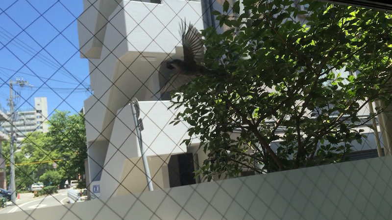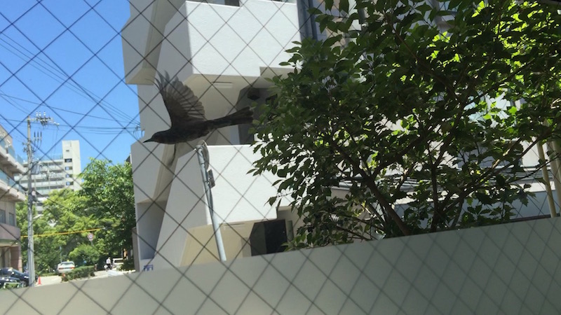 今は暗紫色に熟した実がなっているのですが、昨日、そこそこ大きな鳥が実を食べに来ていたので、店の中から写真を撮ろうとしたら、私に気付いたのか飛び立ってしまい、その時の姿がカメラに収まりました(^^;