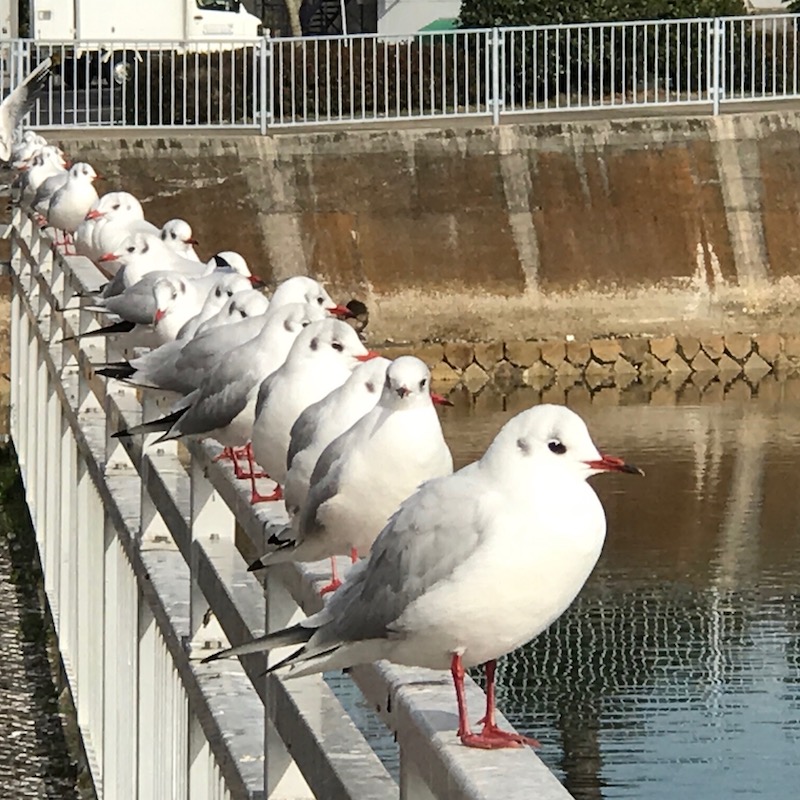 兵庫区の中央卸売市場のそばに川(兵庫運河)があるのですが、そこの柵の上にカモメがいっぱい並んでいたので、思わず写真を撮っちゃいました。