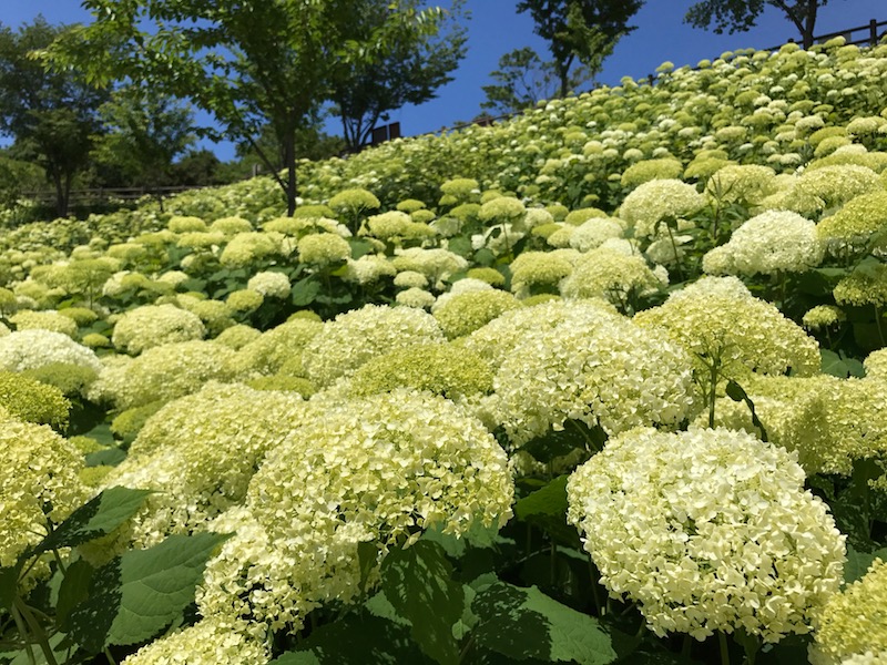 写真は神戸市北区のフルーツフラワーパークに咲いているアジサイ(アナベル)ですが、雨が降って喜んでいるかもしれませんね(^^)