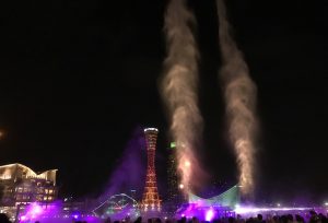音楽に合わせて霧に映し出された色とりどりのレーザーの光、そして60mほどの高さに放たれた水柱がとっても涼しげな、まさに夏の夜にふさわしいイベントでしたよ〜