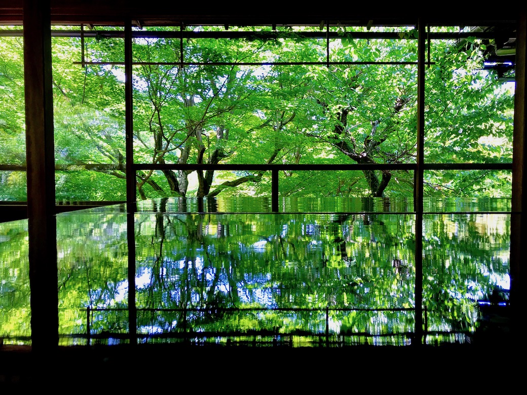 そして建物に入り、2階へ上がるとピカピカに磨かれた机が置いてあり、そこに映り込む青もみじのこれまた綺麗なこと☆