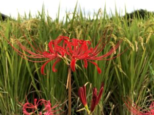 田んぼのあぜ道とかにたくさん咲いてますが、彼岸花には毒があるので、田を荒らす生き物が避けるために植えられたという説があるそうですよ。