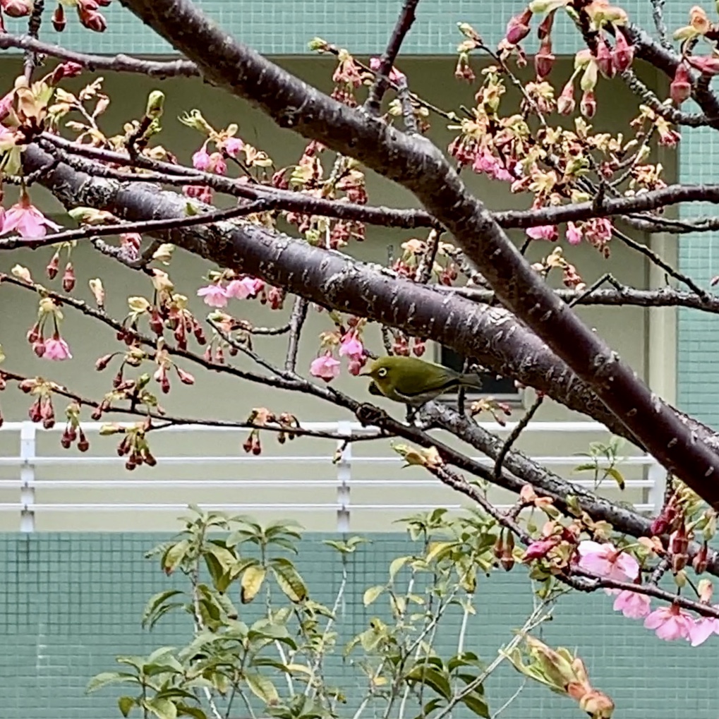 まだまだほとんどツボミですが、少し咲いている花もあり、早速メジロが蜜を吸いに来ていましたよ。