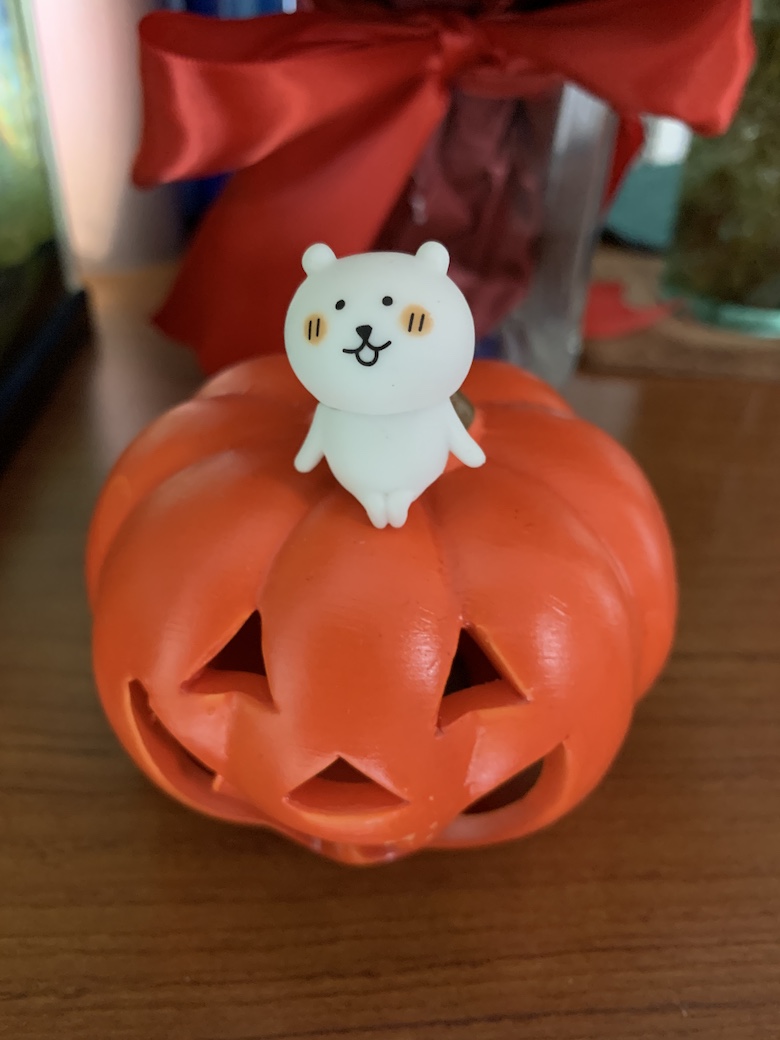 カボチャの上に座ってるのは、先日ガチャガチャでゲットした、どこかで見たようなキャラクターです(^^;