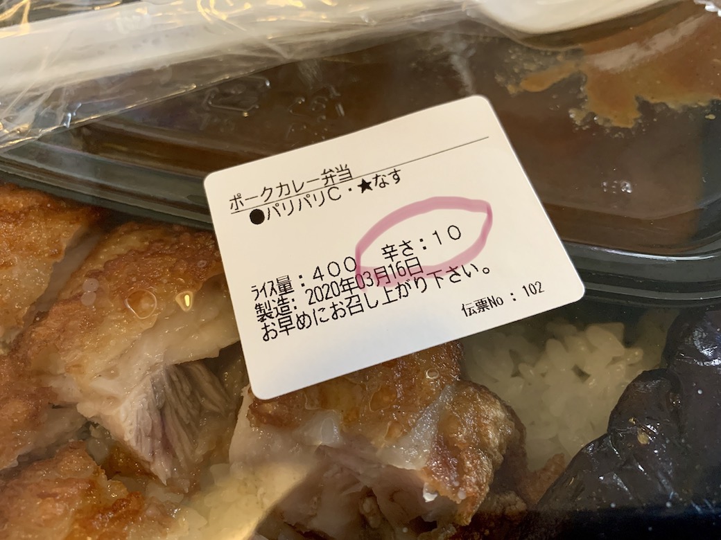 10辛、ご飯400g、トッピングは「なす」「パリパリチキン」で、テイクアウトして自宅でいただきましたよ〜