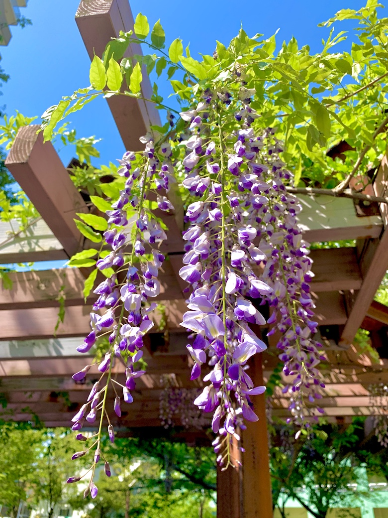 写真は近所の小さな藤棚の花なので、たくさんは咲いていませんでしたが、優しい紫色の花と緑の葉っぱがきれいだったので、1枚撮ってみました(^^)
