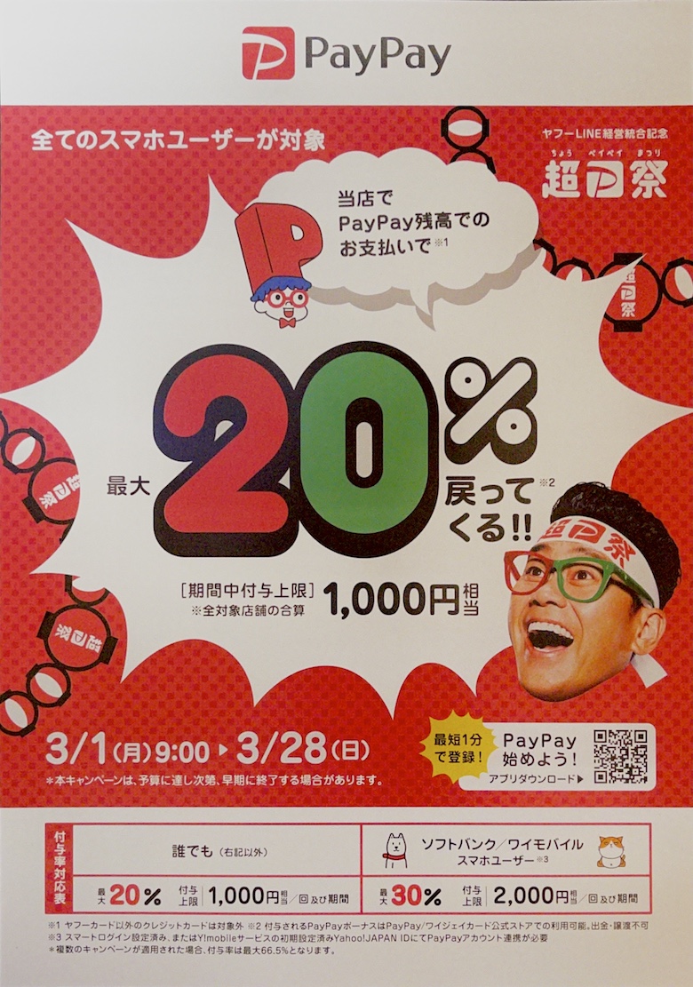 昨日、PayPayから封筒が届いたので、何かと思ったら、3月1日〜28日まで「超PayPay祭」というキャンペーンをするらしく、みなけんも対象店舗になっているとのお知らせでした(^^;