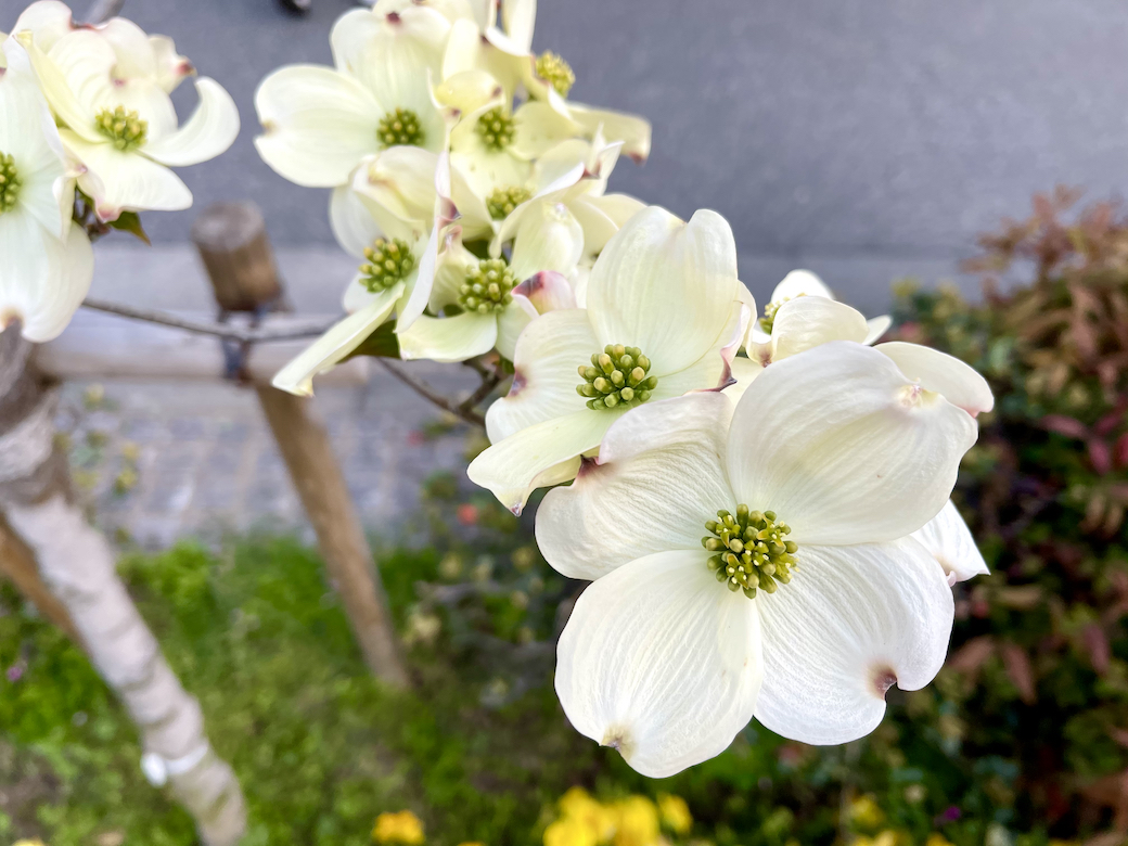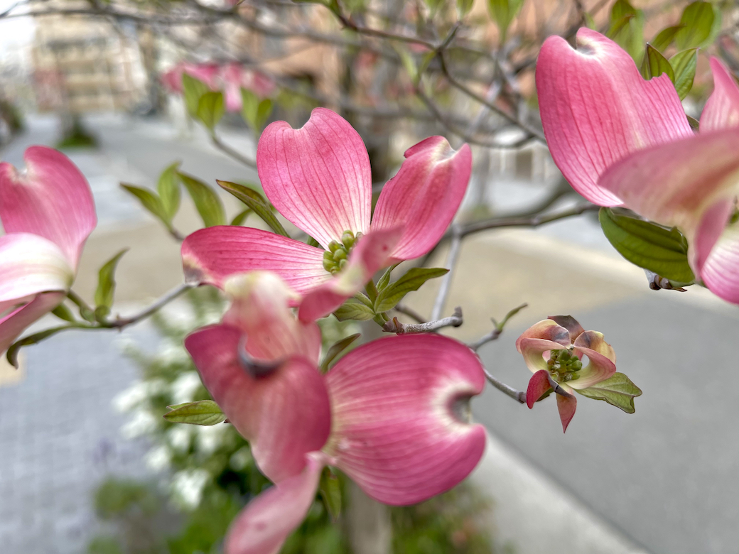 また街中では、街路樹や公園樹などとして植えられたハナミズキがキレイな花を咲かせていますね。下の写真はハナミズキです。