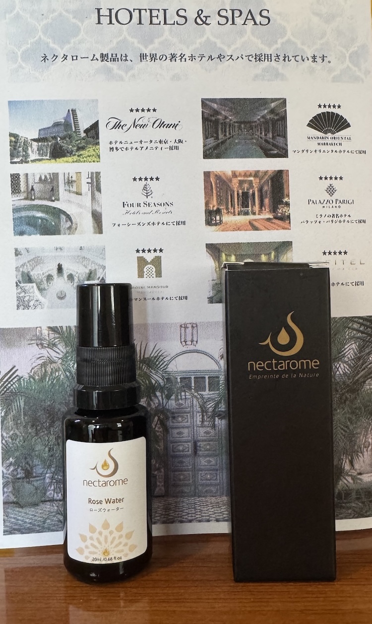 *今回は、豊かな香りと高品質で知られるモロッコのダマスクローズから生まれ、世界の高級ホテルやスパのアメニティとして採用されているネクタローム社の【ローズウォーター(20ml)】をアロマトリートメント120分プレミアムコース、または出張アロマトリートメントをご利用のお客様にプレゼントいたします!