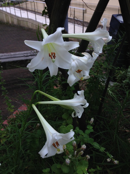 テッポウユリにとてもよく似ていますが、花に薄紫のスジが入っているのが一つの特徴のようです。ただ、テッポウユリとの交雑種も増えていて見分けがつきにくい場合もあるみたいですが…